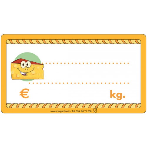 Segnaprezzi per salumeria Morgan cm 11x6, in plastica per alimenti, con fetta di formaggio stilizzata, prezzi per confezioni da 10 pezzi.